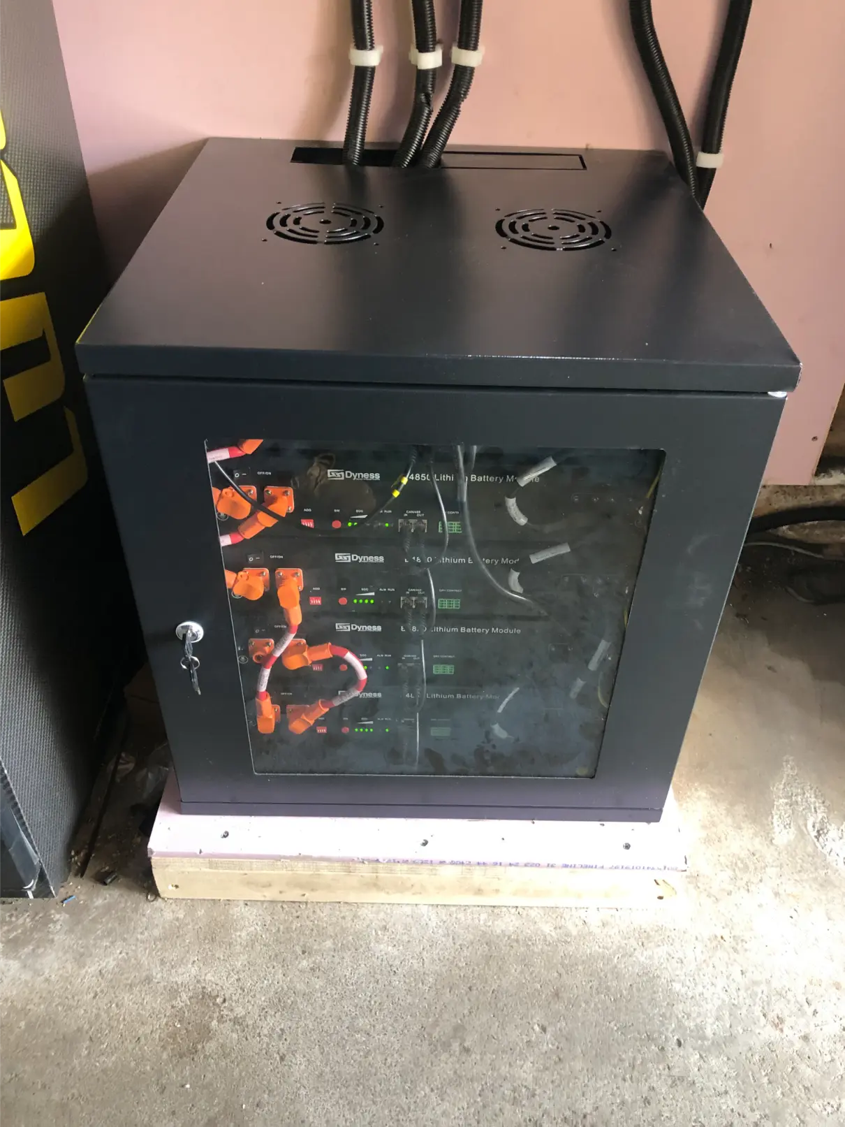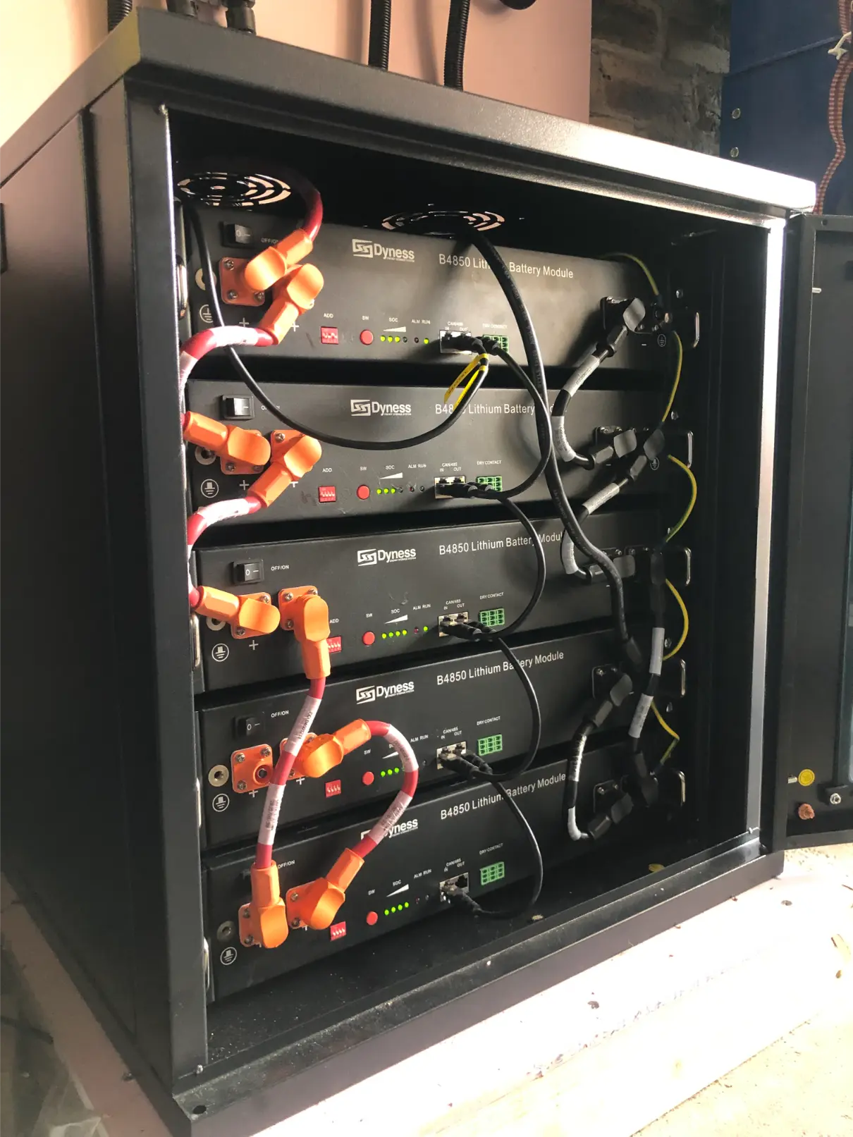 We also moved the dangerously installed batteries and inverter from the roof void to the garage. We installed fire resistant board for the base and lining wall before mounting the batteries and inverter.