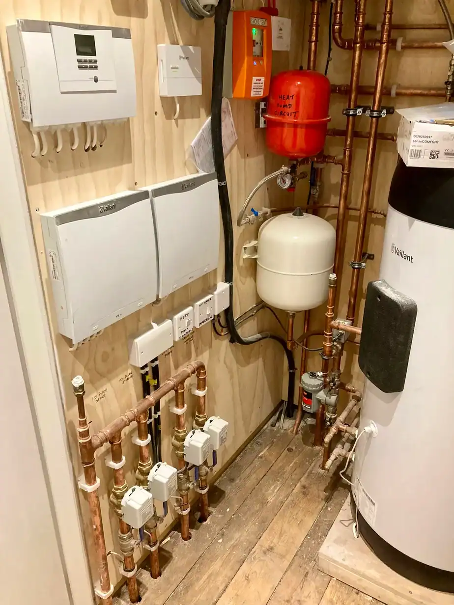 We installed a Vaillant arotherm plus 12kw, Vaillant 250L unvented cylinder and piped in three heating zones each with individual heating controls.
